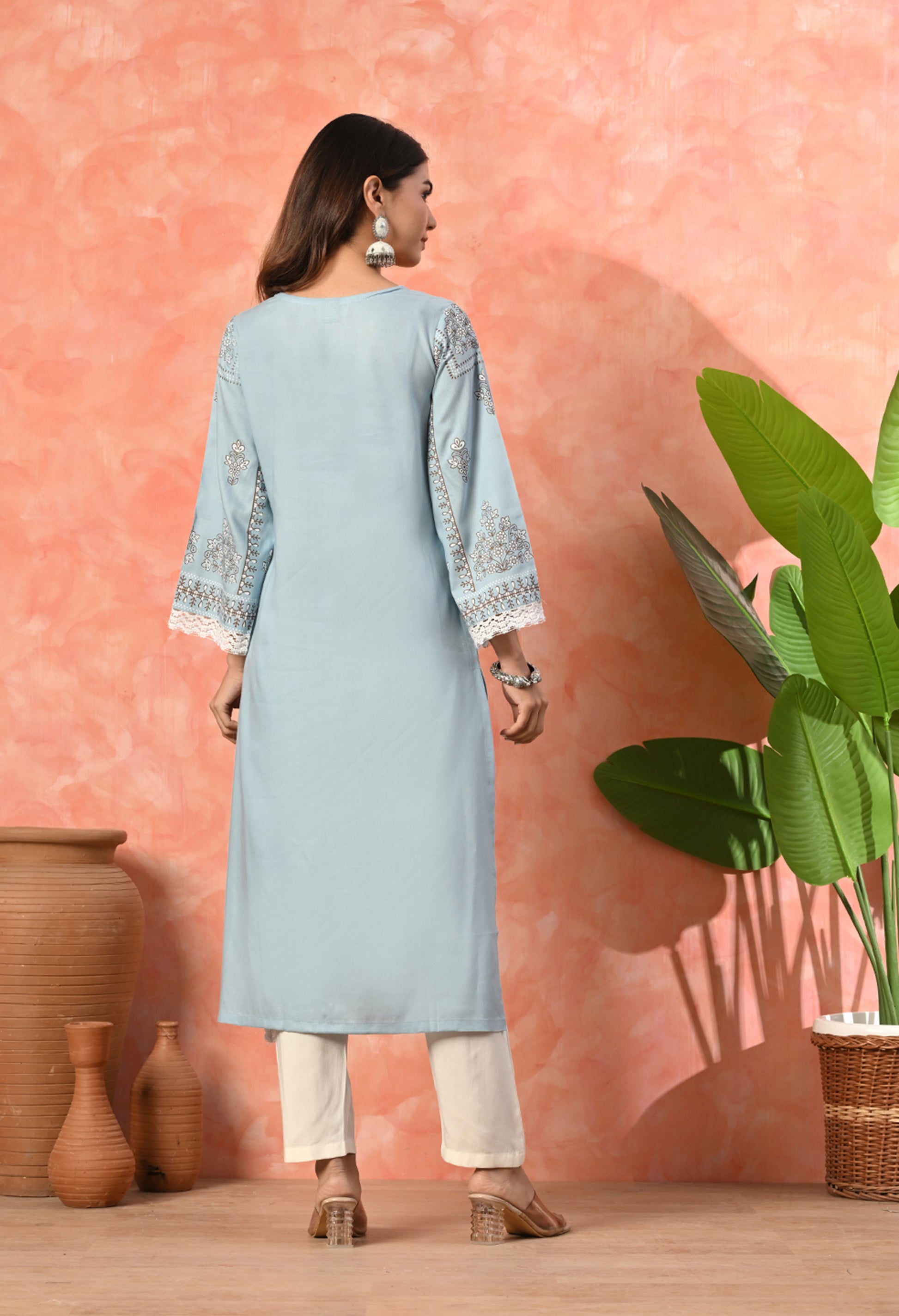 The straight-cut design gives a clean and modest look, while the floral-style prints on the front add a touch of quiet charm. The three-quarter sleeves have a soft lace edge that makes the kurta look even more graceful. The same delicate detail on the hem completes the design in a simple and tasteful way.