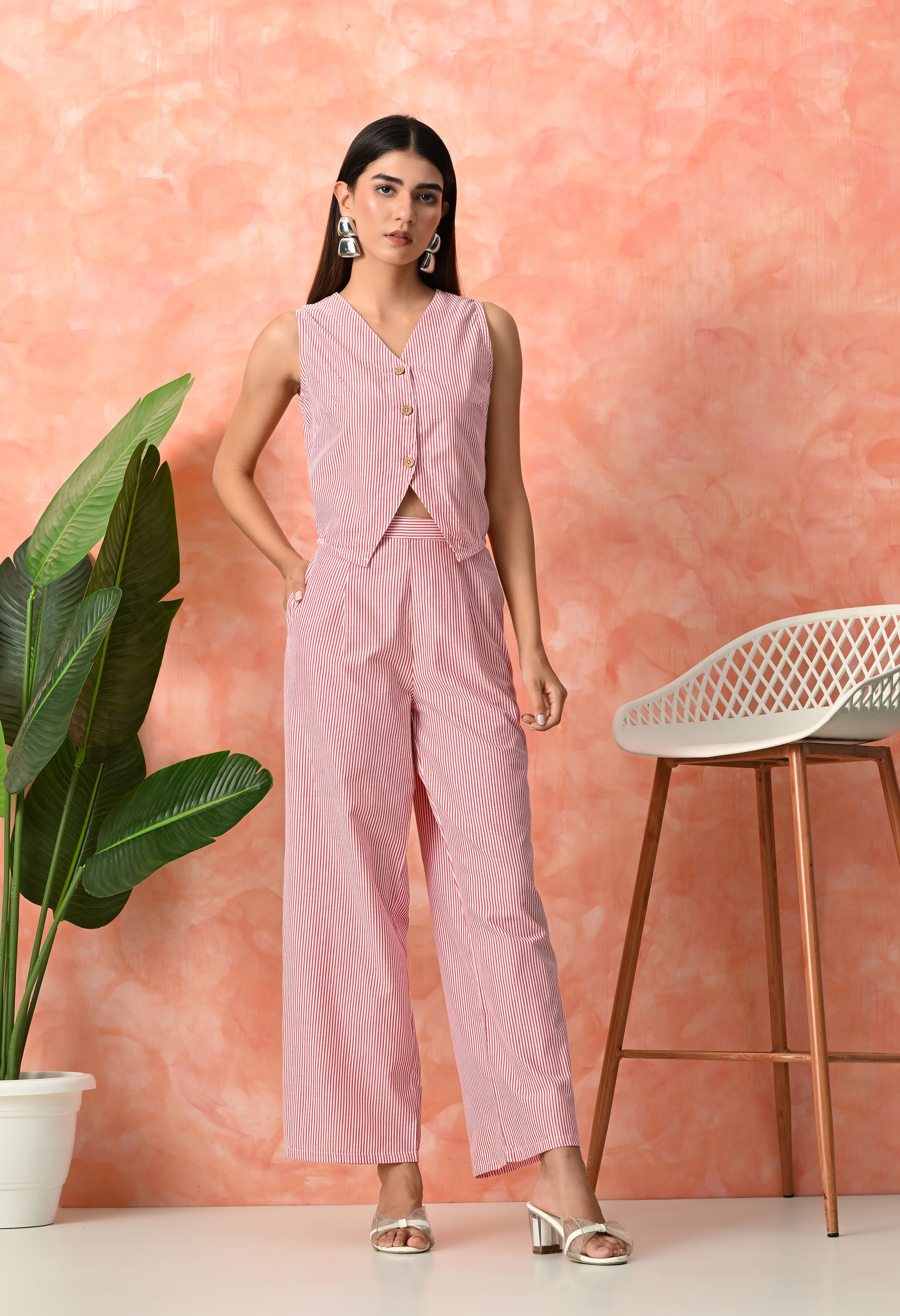 Coral Pink Pinstripe Sleeveless Rayon Co-ord Set with Wide Leg Pants