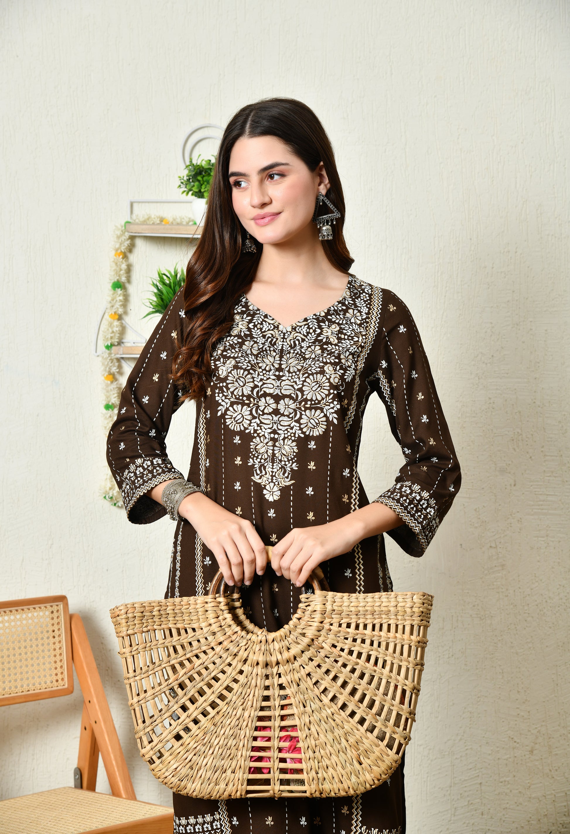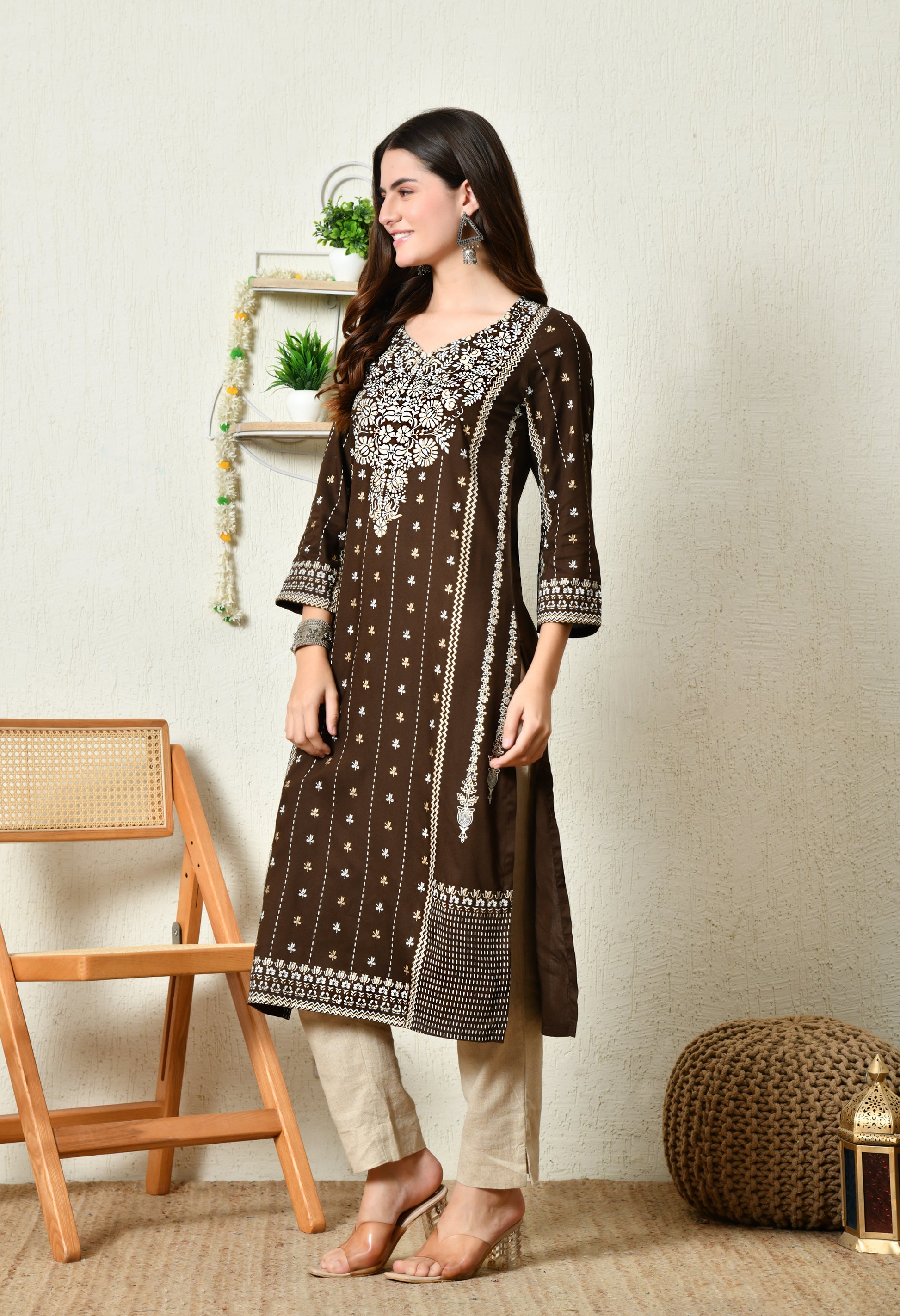 - DESIGN DETAILS: Designed in a rich cocoa brown shade adorned with elegant ivory floral motifs on the front yoke. The vertical buti prints throughout the kurta create a graceful and elongated silhouette.