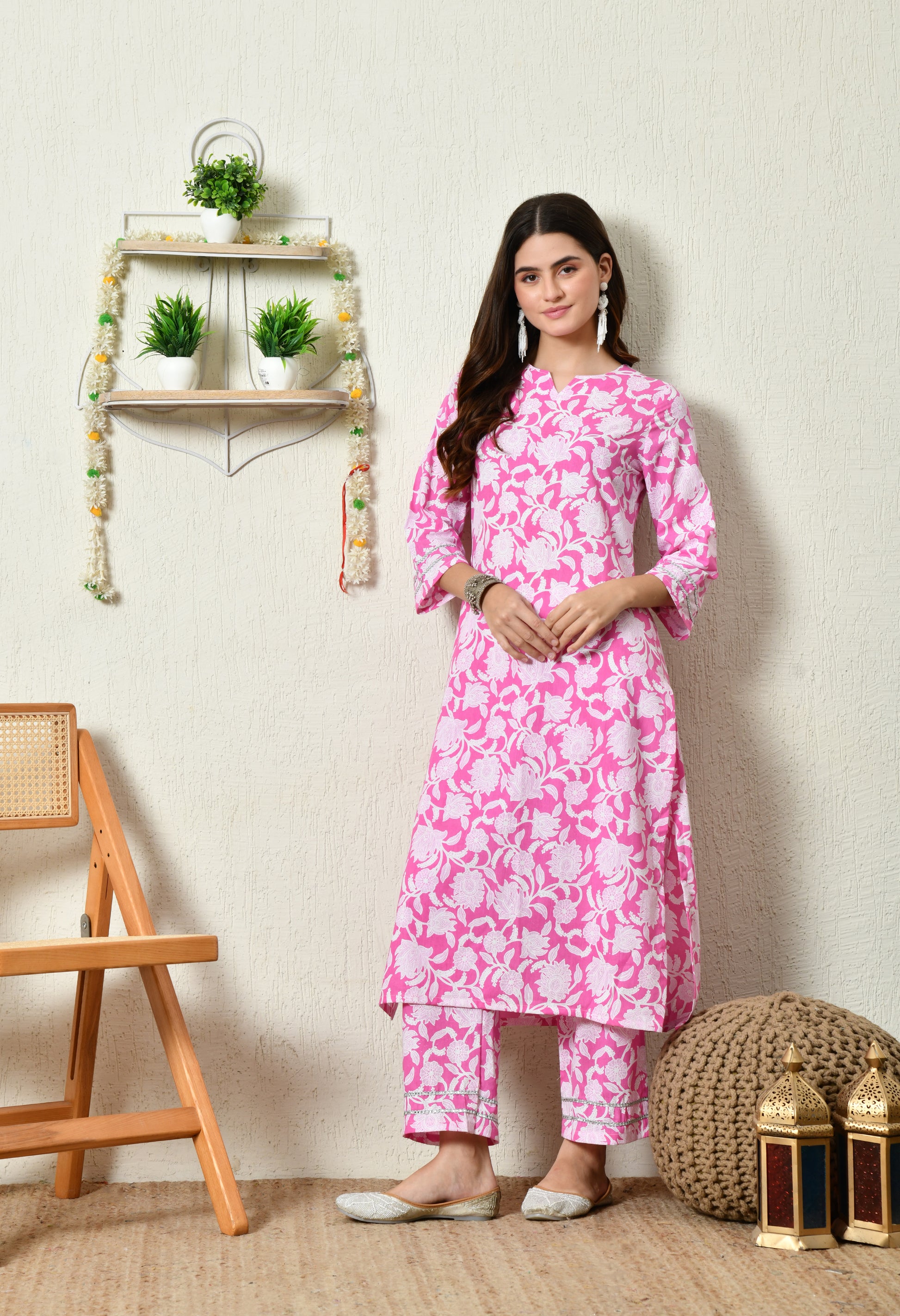 - DESIGN DETAILS: Styled in a vibrant Rani Pink shade featuring all-over white floral motifs inspired by traditional prints. The subtle V-slit neckline enhances the graceful and feminine look.