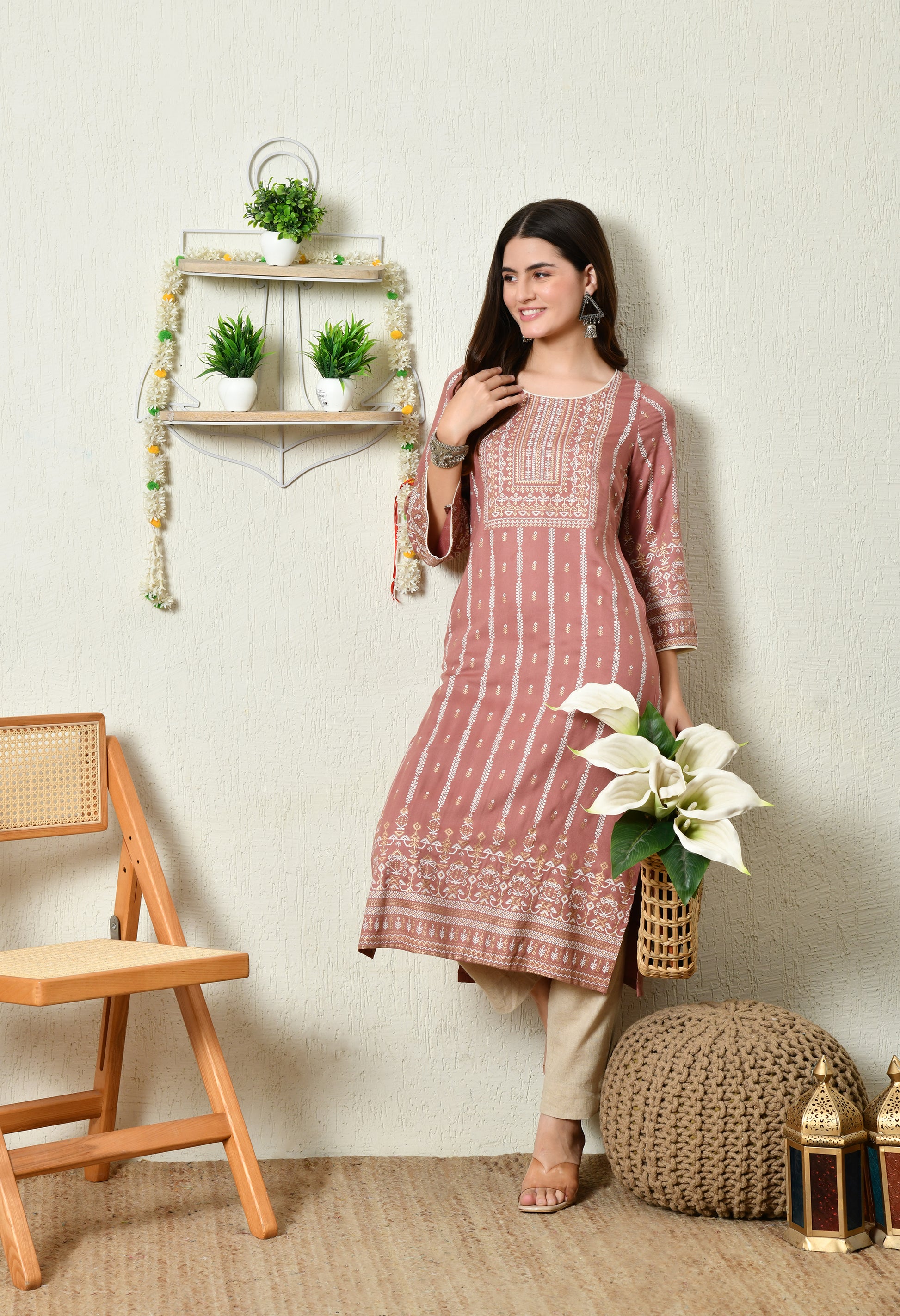 Dusty Rose Heritage Printed Rayon Kurta with Border Detailing & Pocket